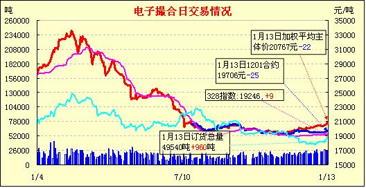 1月13日,全國(guó)棉花交易市場(chǎng)商品棉電子撮合交易成交20400噸,較上一日減少4780噸,訂貨量增加960噸,累計(jì)訂貨49540噸。今日撮合開盤仍然高低不一,有所分歧,之后行情多為先揚(yáng)后抑的走勢(shì),尾盤普遍呈現(xiàn)弱勢(shì),收市時(shí)各合同均價(jià)近跌遠(yuǎn)漲,幅度均在百元以內(nèi);近月MA1201合同收于19410元,跌321元,主力MA1205合同收于20925元,跌43元;盤內(nèi)最低價(jià)為MA1201合同收市價(jià)19410元,最高價(jià)為MA1206合同盤中價(jià)21170元;當(dāng)日成交量萎縮,訂貨量續(xù)增。