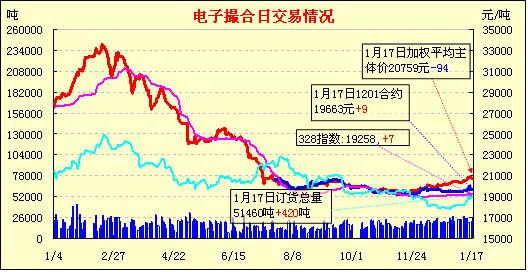 1月17日,全國棉花交易市場商品棉電子撮合交易成交25380噸,較上一日增加3900噸,訂貨量增加420噸,累計訂貨51460噸。今日撮合開盤高低不一,之后行情弱勢震蕩居多,午盤后多呈現(xiàn)震蕩上行之勢,尾盤多數(shù)合同小幅收漲,收市時各合同均價小幅漲跌,幅度均在30元以內(nèi);近月MA1201合同收于19700元,漲46元,主力MA1205合同收于21000元,漲44元;盤內(nèi)最低價為MA1201合同盤中價19505元,最高價為MA1206合同收市價21110元;當(dāng)日成交量續(xù)增,訂貨量小幅續(xù)增。