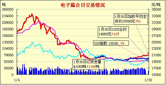 1月30日,全國棉花交易市場商品棉電子撮合交易成交11820噸,較上一日減少2740噸,訂貨量增加1140噸,累計(jì)訂貨61060噸。今日撮合高開,隨后大多數(shù)合同逐漸走高,盤終全盤收漲。其中遠(yuǎn)月MA1207合同開盤后一直無成交,直至尾盤才有240噸訂貨量,最終收于21400元,漲318元。主力合同MA1205收于21070元,漲83元。盤內(nèi)最低價(jià)為近月MA1202合同收盤價(jià)19805元,盤內(nèi)最高價(jià)為MA1207合同,開盤價(jià)、收盤價(jià)、最高價(jià)、最低價(jià)均為21400元。當(dāng)日成交量減少,訂貨量續(xù)增。