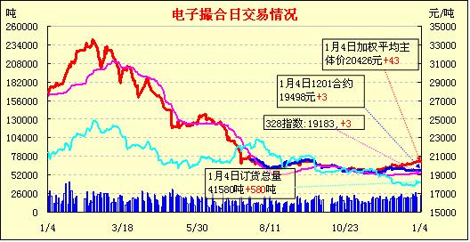 2012年1月4日,全國(guó)棉花交易市場(chǎng)商品棉電子撮合交易成交23720噸,較上一日增加2440噸,訂貨量增加580噸,累計(jì)訂貨41580噸。2012年首日撮合開門紅,各合同全面高開,之后行情上沖乏力,震蕩回穩(wěn),仍在前一日均價(jià)以上運(yùn)行為主,尾盤僅近月收跌,收市時(shí)各合同均價(jià)全面上漲,幅度均在百元以內(nèi);近月MA1201合同收于19480元,跌15元,主力MA1205合同收于20540元,漲37元;盤內(nèi)最低價(jià)為MA1201合同收市價(jià)19480元,最高價(jià)為MA1206合同盤中價(jià)20785元;當(dāng)日成交量有所增加,訂貨量增加。
