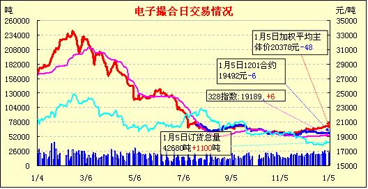 1月5日,全國(guó)棉花交易市場(chǎng)商品棉電子撮合交易成交21800噸,較上一日減少1920噸,訂貨量增加1100噸,累計(jì)訂貨42680噸。今日撮合開(kāi)盤近低遠(yuǎn)高,之后行情震蕩回落,部分合同表現(xiàn)弱勢(shì),尾盤中遠(yuǎn)月合同普遍再現(xiàn)漲勢(shì),收市時(shí)各合同均價(jià)小幅漲跌;近月MA1201合同收于19495元,跌3元,主力MA1205合同收于20575元,漲22元;盤內(nèi)最低價(jià)為MA1201合同開(kāi)市價(jià)19490元,最高價(jià)為MA1206合同盤中價(jià)20795元;當(dāng)日成交量有所減少,訂貨量續(xù)增。