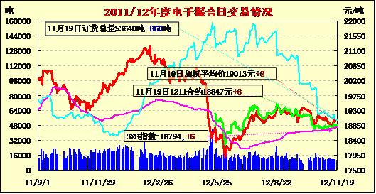 11月19日撮合市場各合同開盤高低不一,日內(nèi)窄幅整理,終盤漲跌互現(xiàn)。當(dāng)日MA1212和MA1304合同價(jià)格上漲,分別漲11元/噸和26元/噸。其余合同均有不同程度的下跌,跌8—52元/噸不等。交易總成交10420噸,較上一交易日增140噸,訂貨量減860噸,累計(jì)訂貨53640噸?;久嫔?,全棉紗行情變化不大,中低檔紗延續(xù)偏弱走勢,出貨不暢;高檔紗方面銷售稍好,部分紗廠停機(jī)現(xiàn)場依然存在。紡織企業(yè)利潤情況有所改善,但仍有虧損現(xiàn)象存在,再加上其看談后市,生產(chǎn)的積極性不高,并不打算大量購買原料。近期市場因?yàn)槭諆?chǔ)而缺乏高等級棉的狀況,因紡織企業(yè)購買熱情不高、港口到港的低價(jià)外棉量逐漸增加及政策的不確定性,似乎正在漸漸失去提振市場的作用。