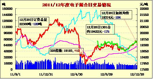 12月28日,撮合市場各合同低開,震蕩下行,終盤收跌。當(dāng)日除了MA1306因無成交價格不變外,其余合同價格減94—175元/噸不等。其中近月MA1301合同減175元/噸,減幅最大。交易總成交11100噸,較上一交易日增760噸。訂貨量減120噸,累計訂貨22380噸。因市場預(yù)期國家將出臺政策,紡織企業(yè)采購原料較為謹(jǐn)慎,雖說市場現(xiàn)貨價格上漲,但基本無成交。而與此同時,因進(jìn)口配額即將發(fā)放的緣故,港口外棉到港量漸多,貿(mào)易商進(jìn)貨較為積極。
