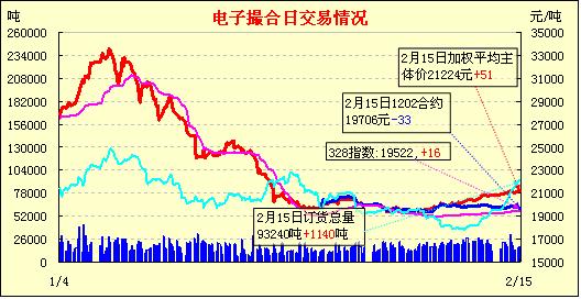 2月15日,全國(guó)棉花交易市場(chǎng)商品棉電子撮合交易成交17140噸,較上一日減少560噸,訂貨量增加1140噸,累計(jì)訂貨93240噸。今日撮合仍以低開為主,之后行情震蕩回暖為主,盤終多數(shù)合同呈現(xiàn)漲勢(shì),收市時(shí)各合同均價(jià)小幅漲跌;近月MA1202合同收于19720元,跌19元,主力MA1205合同收于21060元,漲16元;盤內(nèi)最低價(jià)為MA1202合同收市價(jià)19600元,最高價(jià)為MA1207合同盤中價(jià)21525元;當(dāng)日成交量小減,訂貨量續(xù)增。