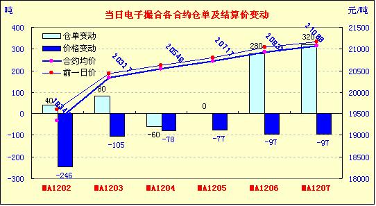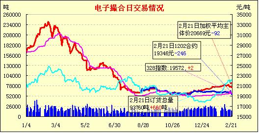 2月21日,全國(guó)棉花交易市場(chǎng)商品棉電子撮合交易成交15350噸,較上一日減少40噸,訂貨量增加660噸,累計(jì)訂貨93760噸。今日撮合各合同全部低開(kāi),前三個(gè)合同盤中震蕩走低,近月合同臨近交割日,跌幅加大;后三個(gè)月合同震蕩走高,但是缺乏支撐,尾盤依舊收低。近月MA1202合同收于19305元,跌95元,主力MA1205合同收于20790元,漲30元;盤內(nèi)最低價(jià)為MA1202合同收市價(jià)19300元,最高價(jià)為MA1207合同盤中價(jià)21100元;當(dāng)日成交量略有減少,訂貨量增加。