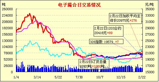 2月22日,全國(guó)棉花交易市場(chǎng)商品棉電子撮合交易成交15560噸,較上一日增加210噸,訂貨量增加1060噸,累計(jì)訂貨93920噸。21日因期待已久的希臘救助協(xié)議終獲批準(zhǔn),美元走軟、歐美股市全線走高,ICE期棉受支撐除近期3月合約小跌外,其他合約普遍收高,主力5月合約結(jié)算價(jià)為92.97美分/磅,漲32點(diǎn);受到外圍提振,今日撮合開(kāi)盤普遍高開(kāi),之后行情高位震蕩為主,尾盤全面保持漲勢(shì),收市時(shí)各合同均價(jià)上漲,幅度多在百元以內(nèi),新合同MA1208未成交;近月MA1203合同收于20400元,漲73元,主力MA1205合同收于20785元,漲68元;盤內(nèi)最低價(jià)為MA1203合同開(kāi)市價(jià)和收市價(jià)20400元,最高價(jià)為MA1207合同盤中價(jià)21215元;當(dāng)日成交量小增,訂貨量續(xù)增。