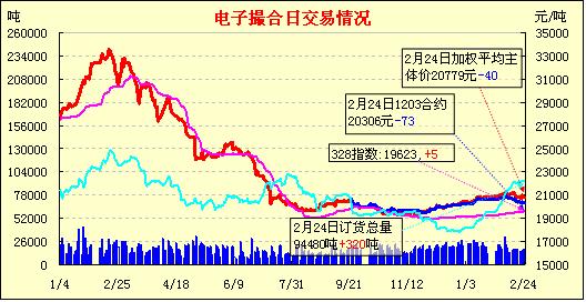2月24日,全國棉花交易市場商品棉電子撮合交易成交14360噸,較上一日減少2700噸,訂貨量增加320噸,累計訂貨94480噸。今日撮合開盤仍低開為主,之后行情多延續(xù)低位走勢,僅遠(yuǎn)月合同表現(xiàn)尚可,收市時各合同跌多漲少,中遠(yuǎn)月合同幅度較明顯;近月MA1203合同收于20280元,跌99元,主力MA1205合同收于20675元,跌82元;盤內(nèi)最低價為MA1203合同收市價20280元,最高價為MA1208合同開市價21130元;當(dāng)日成交量減少,訂貨量小增。