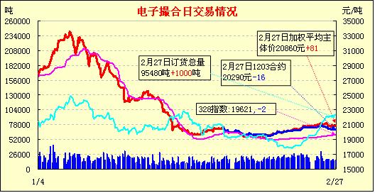 2月27日,全國(guó)棉花交易市場(chǎng)商品棉電子撮合交易成交16160噸,較上一日增加1800噸,訂貨量增加1000噸,累計(jì)訂貨95480噸。今日撮合各合同以高開(kāi)為主,之后行情未能延續(xù)漲勢(shì),多在前一日均價(jià)附近震蕩,尾盤(pán)普遍呈現(xiàn)漲勢(shì),收市時(shí)各合同均價(jià)漲跌不一,多數(shù)合同幅度有限;近月MA1203合同收于20295元,跌11元,主力MA1205合同收于20680元,漲8元;盤(pán)內(nèi)最低價(jià)為MA1203合同盤(pán)中價(jià)20280元,最高價(jià)為MA1208合同成交價(jià)21270元;當(dāng)日成交量增加,訂貨量續(xù)增。