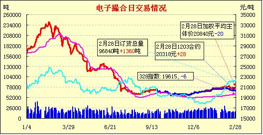 2月28日,全國棉花交易市場商品棉電子撮合交易成交16780噸,較上一日增加620噸,訂貨量增加1360噸,累計訂貨96840噸。今日撮合各合同仍高開居多,之后中遠月合同行情呈現(xiàn)震蕩上行之勢,尾盤僅遠月合同表現(xiàn)弱勢,收市時各合同均價漲多跌少,幅度均在百元以內(nèi);近月MA1203合同收于20300元,漲10元,主力MA1205合同收于20755元,漲90元;盤內(nèi)最低價為MA1203合同盤中價20290元,最高價為MA1208合同開市價21220元;當日成交量小增,訂貨量續(xù)增。