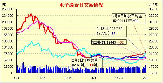 2月8日,全國(guó)棉花交易市場(chǎng)商品棉電子撮合交易成交18460噸,較上一日減少4340噸,訂貨量增加1360噸,累計(jì)訂貨82340噸。今日撮合各合同普遍低開(kāi),之后行情低位震蕩為主,少數(shù)合同回歸昨日均價(jià)附近運(yùn)行,尾盤(pán)多數(shù)合同呈現(xiàn)弱勢(shì),收市時(shí)各合同均價(jià)全面收跌,幅度多在50元以?xún)?nèi);近月MA1202合同收于19800元,跌67元,主力MA1205合同收于21295元,跌25元;盤(pán)內(nèi)最低價(jià)為MA1202合同收市價(jià)19800元,最高價(jià)為MA1207合同開(kāi)市價(jià)和收市價(jià)21770元;當(dāng)日成交量續(xù)減,訂貨量續(xù)增。