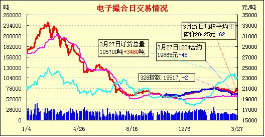 3月27日,全國棉花交易市場商品棉電子撮合交易成交11980噸,較上一日減少700噸,訂貨量增加3480噸,累計訂貨105700噸。今日撮合除近月MA1204合同外全部高開,盤中震蕩走低,終盤各合同均收跌;當(dāng)日多數(shù)合約開盤價即為當(dāng)日最高價;MA1206合同跌幅129元為當(dāng)日收市跌幅最大合同,MA1209合同延續(xù)上市以來的跌勢,當(dāng)日收市跌幅44元?;久嫔希諆εR近結(jié)束,市場觀望心態(tài)加重;目前市場普遍擔(dān)憂在沒有了收儲價的支撐下,一旦國家發(fā)放進口配額,囤積在港口近百萬噸的棉花或?qū)_擊國內(nèi)棉價。