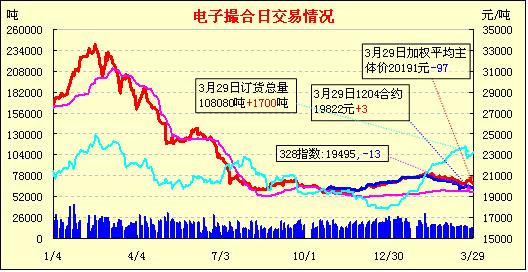 3月29日,全國棉花交易市場商品棉撮合交易成交11160噸,較上一日減少3000噸,訂貨量增加1700噸,累計訂貨量108080噸。今日撮合開盤價高低不一,盤中窄幅震蕩,終盤近漲遠跌;近月合同MA1204、MA1205分別小幅收漲31元和10元;其他合約繼續(xù)延續(xù)下跌態(tài)勢,MA1208合同跌幅56元為當(dāng)日收市跌幅最大合同,其他合同跌幅在14-47元之間?;久嫔希F(xiàn)貨價格繼續(xù)疲軟,中國棉花價格指數(shù)延續(xù)下調(diào)態(tài)勢,市場對收儲結(jié)束后期價格預(yù)判模糊,觀望氣氛加重,靜待即將公布的種植數(shù)據(jù)報告以及可能的各種政策信號引導(dǎo)。