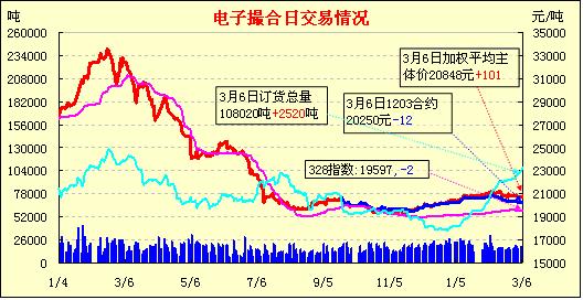 3月6日,全國(guó)棉花交易市場(chǎng)商品棉電子撮合交易成交14380噸,較上一日減少4580噸,訂貨量增加2520噸,累計(jì)訂貨108020噸。5日因印度政府發(fā)布棉花出口禁令,ICE期棉受刺激全面大幅告漲,主力5月合約結(jié)算價(jià)92.23美分/磅,漲400點(diǎn);此利好消息同樣作用于國(guó)內(nèi)電子盤,繼昨日下午盤面上行后,今日撮合各合同普遍高開,之后行情上行乏力,震蕩回落成為主流,尾盤多數(shù)合同呈現(xiàn)跌勢(shì),收市時(shí)各合同均價(jià)小幅漲跌,幅度仍在百元以內(nèi);近月MA1203合同收于20250元,跌12元,主力MA1204合同收于20460元,漲6元;盤內(nèi)最低價(jià)為MA1203合同成交價(jià)20250元,最高價(jià)為MA1208合同開市價(jià)21360元;當(dāng)日成交量萎縮,訂貨量續(xù)增。