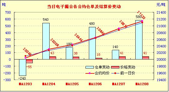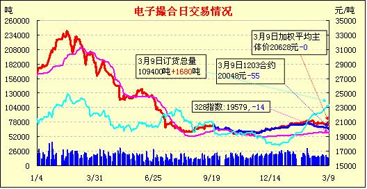 3月9日,全國(guó)棉花交易市場(chǎng)商品棉電子撮合交易成交13640噸,較上一日增加1020噸,訂貨量增加1680噸,累計(jì)訂貨109400噸。今日撮合各月合同開(kāi)盤高低各半,隨后行情稍有分歧,震蕩上行居多,盤終除近月MA1203合同收跌以外,其他各合同均告收漲。MA1203合同收于20040,跌63元。主力MA1204合同收于20300,漲35元。盤內(nèi)最低價(jià)為MA1203合同開(kāi)市價(jià)20030元,最高價(jià)為MA1208合同收市價(jià)21160元。當(dāng)日成交量增加,定貨量增加。