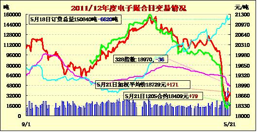 5月21日電子撮合縮量增倉,均價反彈。撮合市場受近日會議信息提振以及周邊商品市場的反彈提振,早盤多數(shù)合同高開,隨后在買盤的帶動各合同全天維持高位震蕩,終盤收漲。整體看,由于前期撮合市場價格的持續(xù)下探,其部分合同價格已低于現(xiàn)貨價格,在買盤的推動下短期繼續(xù)下探動能減弱,反彈或?qū)⒍虝貉永m(xù)。撮合交易總成交17260噸,較上一日減少26520噸,訂貨量增加3200噸,累計訂貨154040噸。