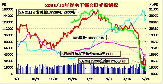 5月24日電子撮合量倉(cāng)均減,均價(jià)反彈。隔夜,市場(chǎng)圍繞希臘能否繼續(xù)留在歐元區(qū)的質(zhì)疑升溫推動(dòng)美元繼續(xù)走高,外部商品市場(chǎng)普遍延續(xù)跌勢(shì),紐約期棉同樣受累大幅下挫,主力7月合約結(jié)算價(jià)71.51美分/磅,跌301點(diǎn),遠(yuǎn)期12月合約68.75美分/磅,跌282點(diǎn)。今日撮合市場(chǎng)開盤高低不一,隨后窄幅走高,終盤全線收漲。交易總成交16420噸,較上一日減少6820噸,訂貨量減少2100噸,累計(jì)訂貨132720噸。近日中國(guó)政府稱將采取更多刺激措施的政策傾向,或是疲軟市場(chǎng)的一劑強(qiáng)心劑。