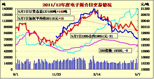 5月7日電子撮合縮量增倉,均價續(xù)跌。今日撮合開盤高低不一,盤中弱勢震蕩,終盤收跌;當日遠月MA1210合同今日反彈收高,其他合同續(xù)跌。交易總成交11780噸,較上一日減少11920噸,訂貨量增加140噸,累計訂貨量137180噸。基本面上,商品市場整體受挫,棉花繼續(xù)表現(xiàn)疲軟。從廣交會上獲悉的數(shù)據(jù)看,來自歐盟和美國的訂單下滑,市場后期的消費需求不樂觀。市場人士指出,棉花市場繼續(xù)面臨下游消費乏力格局,短期內難有大作為。
