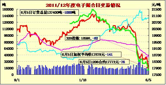 6月5日撮合交易量倉(cāng)均縮,跌勢(shì)放緩。隔夜,因國(guó)際棉花咨詢委員會(huì)(ICAC)最新全球棉花供需預(yù)測(cè)報(bào)告利空及美國(guó)主產(chǎn)棉區(qū)出現(xiàn)降雨,此外市場(chǎng)圍繞歐洲債務(wù)危機(jī)蔓延的擔(dān)憂日益升溫,紐約期棉延續(xù)上周跌勢(shì)繼續(xù)全面走低,近期7月合約結(jié)算價(jià)68.53美分/磅,跌6點(diǎn),12月合約67.06美分/磅,跌55點(diǎn)。撮合市場(chǎng)早盤繼續(xù)全線低開,窄幅下行,午后盤雖有反彈,但終盤仍報(bào)跌。交易總成交15160噸,較上一日減少2860噸,訂貨量減少1000噸,累計(jì)訂貨137400噸。 基本面上,棉花本身商品屬性的利空并無(wú)有效改善;宏觀方面,由于各方經(jīng)濟(jì)數(shù)據(jù)欠佳,市場(chǎng)對(duì)美聯(lián)儲(chǔ)推行第三輪量化寬松的預(yù)期再度升溫,美元的高位回落使得商品市場(chǎng)得到短暫喘息機(jī)會(huì),或因超跌而出現(xiàn)反彈可能,不過(guò)6月份歐美問(wèn)題最終如何演化無(wú)疑將關(guān)系到整個(gè)全球金融市場(chǎng)的方向選擇,因此當(dāng)前市場(chǎng)還應(yīng)謹(jǐn)慎觀望。