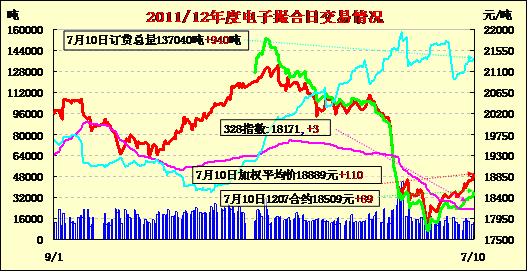 7月10日撮合交易放量增倉,大幅續(xù)漲。遠(yuǎn)期合同漲幅大于近期合同,其中MA1212合同均價(jià)上漲139元/噸,為當(dāng)日漲幅最大合同,其他合同漲幅在89-137元/噸不等。交易總成交12980噸,較上一日增加1580噸,訂貨量增加940噸,累計(jì)訂貨137040噸。基本面上,棉花現(xiàn)貨消費(fèi)疲軟依舊,處于高位的期末庫存以及倉單壓力繼續(xù)抑制棉價(jià)高企。預(yù)期美國農(nóng)業(yè)部將于11日公布的全球棉花供需預(yù)測報(bào)告或會(huì)好于預(yù)期,市場短期有望延續(xù)反彈 .