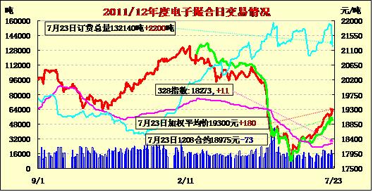 7月23日,撮合市場各合同雖多數(shù)高開,但盤中窄幅走低,終盤收跌。MA1211合同均價跌86元/噸為當日跌幅最大合同,其他合同跌幅在71-84元/噸之間。交易總成交15600噸,較上一日減少4060噸,訂貨量增加2200噸,累計訂貨132140噸?;久嫔希暧^經(jīng)濟層面再生禍端,外圍市場傳來消息IMF將停止向希臘發(fā)放進一步救助資金,德國不再向希臘發(fā)放救助金。希臘違約、退歐風險驟增,另外西班牙局勢全面惡化,可能成第二個希臘。市場對歐債危機擔心情緒再度升溫。對于國內(nèi)棉花市場的后期走勢,目前業(yè)內(nèi)人士依舊擔心國家的收拋儲政策,使得短期內(nèi)市場有所反復。