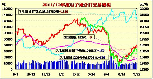 7月25日撮合市場各合同多數(shù)低開,盤中震蕩下行,終盤收跌。MA1212合同均價跌204元/噸為當日跌幅最大合同,其他合同跌幅在158-203元/噸之間。交易總成交16320噸,較上一日增加2680噸,訂貨量增加1140噸,累計訂貨135760噸?;久嫔?,由于歐盟經濟環(huán)境再度惡化,外圍商品市場特別是農產品市場出現(xiàn)大幅調整,國內棉花市場受累紡織品出口形勢依舊難以有效企穩(wěn),雖然近期全國大范圍的降雨和收儲對未來棉價有支撐作用,但同時也有其他利空因素頻頻充斥市場,所以近期棉價難以有效走出單邊市。