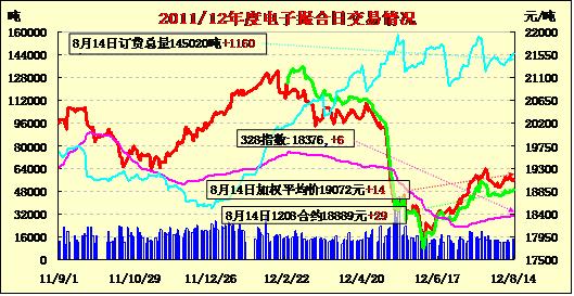 8月14日撮合市場各合同開盤高低不一,日內(nèi)寬幅震蕩,終盤多數(shù)收漲。當(dāng)日遠(yuǎn)月MA1212合同和MA1301合同分別小幅收跌2元/噸和4元/噸,其他合同均微漲,其中MA1208合同漲29元/噸為當(dāng)日漲幅最大合同。交易總成交12880噸,較上一日減少1400噸,訂貨量增加2580噸,累計(jì)訂貨143860噸?;久嫔?,市場對(duì)于美農(nóng)的利空數(shù)據(jù)以及產(chǎn)業(yè)鏈的整體疲軟數(shù)據(jù)已經(jīng)有所消化,雖然短期內(nèi)看不到好轉(zhuǎn)的跡象,但由于受到收儲(chǔ)價(jià)的支撐,市場在進(jìn)入新年度前平穩(wěn)過渡的概率較大 .