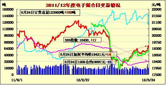 8月24日撮合市場縮量增倉,均價續(xù)跌。MA各合同多數(shù)低開,日內(nèi)弱勢震蕩,終盤收跌。遠月MA1302合同均價下跌51元/噸為當日跌幅最大合同,其他合同跌幅在14-27元/噸不等。撮合交易總成交14360噸,較上一日減少280噸,訂貨量增加780噸,累計訂貨123860噸?;久嫔?,Cotton Outlook最新報告顯示到明年7月全球棉花供應過剩料超過300萬噸,中國需求的下降占較大比重。從當前國內(nèi)市場下游企業(yè)反映的情況看,當前受國內(nèi)原料價格高企以及外圍需求不振雙重影響,企業(yè)多舉步維艱,期待有政策上的幫助。原料市場上各路企業(yè)正在加緊進入新年度的備戰(zhàn)中。