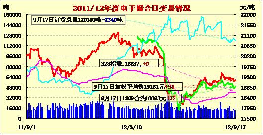 9月17日撮合市場倉量減少,均價(jià)全面上漲。除MA1210平開外,其他各合同均高開,日內(nèi)震蕩走高,終盤收高。當(dāng)日MA1211合同漲101元/噸,漲幅最大。其他各合同漲56—86元/噸不等。交易總成交11780噸,較上交易日減840噸,訂貨量減2340噸,累計(jì)訂貨120340噸?;久嫔?,收儲啟動(dòng)后,13日首次出現(xiàn)成交,成交量為1400噸。之后14日成交1520噸。目前新棉上市量逐步加大,按市場情況,上市的滿足收儲規(guī)格的棉花將流入國儲,隨著交儲活動(dòng)氣氛變得活躍,收儲托市的政策將主導(dǎo)市場。近期,港口棉花通關(guān)速度加快,成交的儲備棉出庫也加快,市場上可用棉量加大,下游需求仍疲軟,這將使現(xiàn)貨市場成交氛圍繼續(xù)清淡。