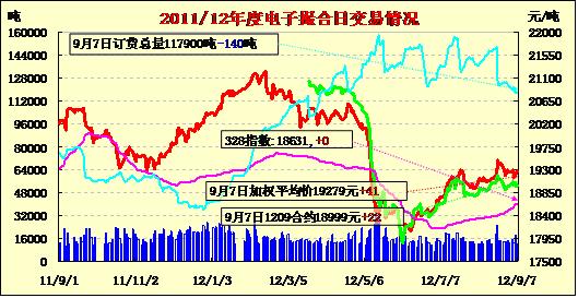 9月7日撮合交易量倉量減少,均價互有漲跌。各合同開盤價互有高低,日內(nèi)窄幅震蕩,終盤各有漲跌。當日除遠月MA1302合同跌20元/噸外,其他各合同均上漲,漲幅在6-27元/噸。交易總成交10780噸,較上交易日減1400噸,訂貨量減140噸,累計訂貨117900噸?;久嫔希?月6日儲備棉投放數(shù)量為45163.79噸,實際成交32884.43噸,成交儲備棉平均等級為3.04,平均長度27.88,加權(quán)成交價18602元/噸,折328級成交價為18649元/噸(公重)。棉副方面,近日受外圍產(chǎn)品行情調(diào)整影響,棉油、粕漲勢受到限制,觀望情緒出現(xiàn),而棉短絨弱勢表現(xiàn)再度顯露,棉殼報價也有局部回調(diào),各地新籽上市量依然有限,成交較為緩慢,產(chǎn)品行情波動使得各方持謹慎態(tài)度。宏觀經(jīng)濟方面,歐洲央行公布旨在遏制歐債危機的新購債計劃,從美國申請失業(yè)救濟人數(shù)上看,復(fù)蘇緩慢的美國就業(yè)市場顯示向好跡象,這提振了市場人氣。