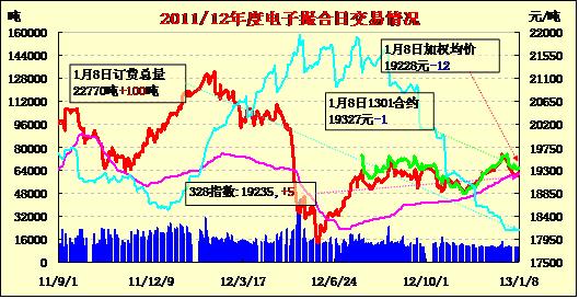 1月8日撮合各合同高開,日內(nèi)寬幅震蕩,終盤價格漲跌不一。當日MA1301合同價格跌1元/噸,MA1302、MA1303和MA1305價格分別漲27、19和6元/噸,其余合同價格不變。交易成交10620噸,較上一交易日增40噸。訂貨量增加100噸,累計訂貨22770噸。目前紡織企業(yè)多在為儲備棉競拍做準備。市場人士稱,隨著拋儲日期的臨近,市場資源相對趨于寬松已成定局,但具體細則還未明晰前,底部支撐價格仍有待商榷。