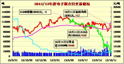 10月11日,商品棉交易各合同開盤高低不一,均價(jià)漲跌互現(xiàn)。MA1310平均價(jià)18650漲532,MA1311平均價(jià)19620漲5,MA1312均價(jià)19523跌50,MA1401均價(jià)19403漲17,MA1402平均價(jià)19299跌2,MA1403均價(jià)18945不變。交易成交14480噸,較上一交易日增220噸。訂貨量增加3440噸,累計(jì)訂貨18780噸。