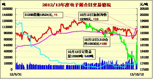 10月12日,商品棉交易各合同開盤高低不一,全線收漲。MA1310平均價18830漲180,MA1311平均價19659漲39,MA1312均價19650漲127,MA1401均價19445漲42,MA1402平均價19332漲33,MA1403均價18945不變。交易成交12520噸,較上一交易日減1960噸。訂貨量減少540噸,累計訂貨18240噸。
