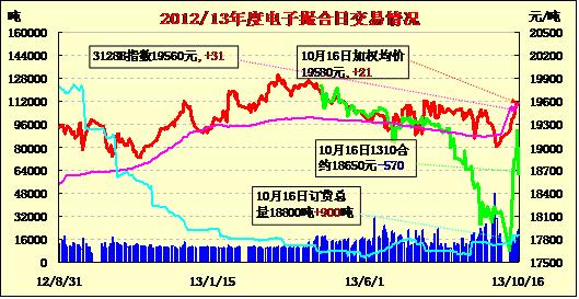 10月16日,商品棉交易各合同全線低開,多數(shù)下跌。MA1310平均價(jià)18650跌570,MA1311平均價(jià)19762跌268,MA1312均價(jià)19693跌17,MA1401均價(jià)19582跌7,MA1402平均價(jià)19496漲7,MA1403均價(jià)18945不變。交易成交22780噸,較上一交易日增1660噸。訂貨量增加900噸,累計(jì)訂貨18800噸。