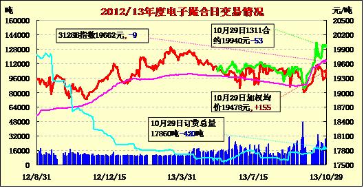 10月29日商品棉交易合同開盤高低不一,寬幅震蕩,漲多跌少。MA1311平均價19940跌53,MA1312均價19644漲99,MA1401均價19516漲42,MA1402平均價19339跌3,MA1403均價19080跌43,MA1404均價19100漲360。交易成交25120噸,較上一交易日減4060噸。訂貨量減420噸,累計訂貨17860噸。