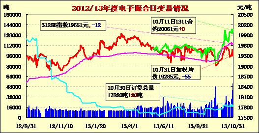 10月30日商品棉交易各合同開盤高低不一,寬幅震蕩,均價(jià)上漲。MA1311平均價(jià)20061持平,MA1312均價(jià)19781漲21,MA1401均價(jià)19579漲40,MA1402平均價(jià)19293漲5,MA1403均價(jià)19082漲25,MA1404均價(jià)19000漲329。交易成交52720噸,較上一交易日增10160噸。MA1401合同成交較昨日大幅縮減4500噸,其余三合同成交較昨日漲跌幅度甚微。訂貨量增加20噸,累計(jì)訂貨17820噸。除遠(yuǎn)月MA1404合同較昨日訂貨增加20噸外,其余合同訂貨量均較昨日持平。