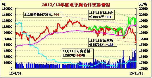 11月11日,商品棉交易各合同低開,窄幅整理,均價多數(shù)下跌。倉量增加,均價多數(shù)下跌。MA1311平均價19880跌111,MA1312均價19597跌23,MA1401均價19556跌32,MA1402平均價19107漲6,MA1403均價18360跌51,MA1404均價18364跌14。交易成交43820噸,較上一交易日增加2720噸。訂貨量增加640噸,累計訂貨18580噸。