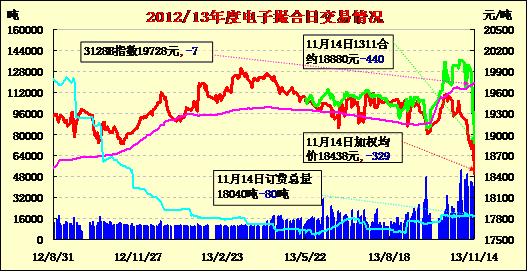 11月14日,商品棉交易多數(shù)合同低開,日內(nèi)寬幅震蕩,均價漲跌不一。MA1311平均價18880跌440,MA1312均價19480跌20,MA1401均價19296跌186,MA1402平均價19077漲7,MA1403均價18269漲43,MA1404均價18235跌41。交易成交28700噸,較上一交易日減少11640噸。訂貨量減80噸,累計訂貨18040噸。