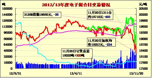 11月20日,商品棉交易各合同開盤高低不一,終盤近跌遠漲。MA1311平均價18710漲3,MA1312均價19010不變,MA1401均價18978跌75,MA1402平均價18564跌119,MA1403均價18074漲19,MA1404均價18000漲25。交易成交39720噸,較上一交易日減3300噸。訂貨量增加300噸,累計訂貨18020噸。