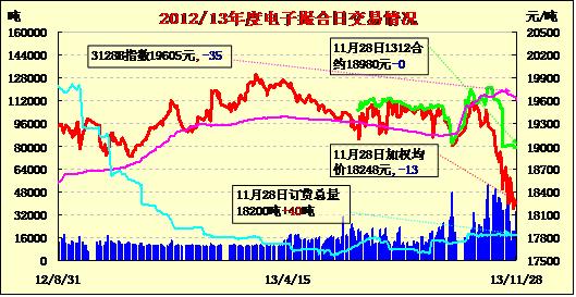 11月28日,商品棉交易多數(shù)合同高開(kāi),日內(nèi)寬幅震蕩,終盤(pán)漲跌互現(xiàn)。MA1312均價(jià)18980不變,MA1401均價(jià)18581跌167,MA1402平均價(jià)18412漲72,MA1403均價(jià)18263漲57,MA1404均價(jià)18190漲20,MA1405均價(jià)18118跌99。交易成交33940噸,較上一交易日增加13780噸。訂貨量增加40噸,累計(jì)訂貨18160噸。