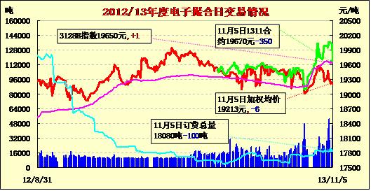 11月5日,商品棉交易各合同低開(kāi),多數(shù)下跌。MA1311平均價(jià)19670跌350,MA1312均價(jià)19705跌66,MA1401均價(jià)19575漲8,MA1402平均價(jià)19208跌7,MA1403均價(jià)18664跌315,MA1404均價(jià)19000持平。交易成交45440噸,較上一交易日增加25060噸。訂貨量減少100噸,累計(jì)訂貨18080噸。