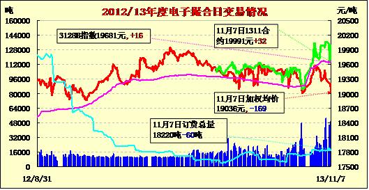 11月7日,商品棉交易多數(shù)合同低開,日內(nèi)寬幅震蕩,均價漲跌不一。MA1311平均價19991漲321,MA1312均價19620跌2,MA1401均價19590漲10,MA1402平均價19166跌29,MA1403均價18479跌76,MA1404均價18459跌541。交易成交50140噸,較上一交易日增加12480噸。訂貨量減少60噸,累計訂貨18220噸。