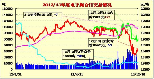 12月10日,商品棉交易多數(shù)合同低開,日內(nèi)窄幅整理,均價漲跌互現(xiàn)。MA1312均價19005漲77,MA1401均價18858漲37,MA1402平均價18452跌1,MA1403均價18328漲5,MA1404均價18203跌10,MA1405均價18225跌3。交易成交10600噸,較上一交易日增420噸。訂貨量減720噸,累計訂貨16480噸。