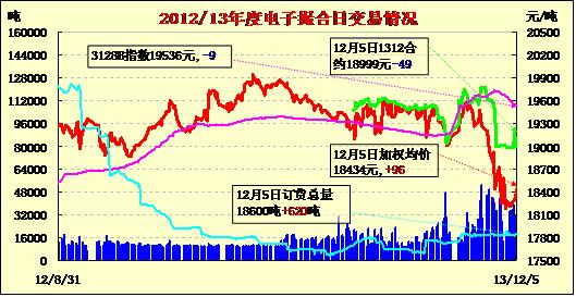 12月5日,商品棉交易各合同開盤高低不一,均價(jià)近跌遠(yuǎn)漲。MA1312均價(jià)18999跌49,MA1401均價(jià)18731跌55,MA1402平均價(jià)18432跌9,MA1403均價(jià)18341漲54,MA1404均價(jià)18188漲20,MA1405均價(jià)18192漲33。交易成交19320噸,較上一交易日減少12360噸。訂貨量增620噸,累計(jì)訂貨18600噸。