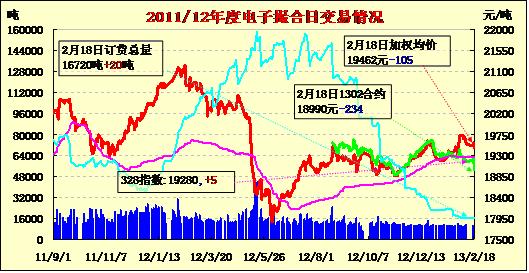 2月18日,撮合交易各合同開盤高低不一,日內(nèi)寬幅震蕩,均價漲跌各異。當(dāng)日近月MA1302合同大幅下跌234元/噸,MA1303跌80元/噸,MA1307跌48元/噸。其余合同價格變化不大。交易成交10540噸,較上一交易日增60噸。訂貨量增20噸,累計(jì)訂貨16720噸。紡紗廠家陸續(xù)開業(yè),生產(chǎn)沒有恢復(fù),紗線交易寥寥,需求難以被激發(fā),現(xiàn)貨成交基本處于停滯。全棉紗價格基本維持不變,高支紗價格微浮,低等棉供大于求,低級粗支紗庫存批量充足。