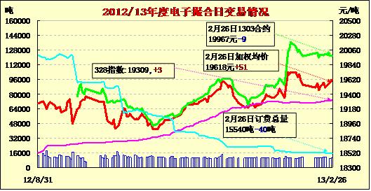 2月26日,商品棉交易多數合同開盤高開,日內寬幅震蕩,終盤漲跌不一。當日MA1303和MA1304合同均價分別跌9和6元/噸,MA1304、MA1306、MA1307和MA1308分別均價漲8、25、86和96元/噸。交易成交10340噸,較上一交易日增120噸。訂貨量減40噸,累計訂貨15540噸。紗線市場整體行情依舊清淡,紡紗廠的出廠報價雖有些堅挺,但市場成交寥寥無幾,實際價格有較大差異,經營商們的觀望情緒依舊濃重。港口現貨報價隨前一日紐期價格大幅下跌,但買家積極性并未被調動,市場詢盤一般。