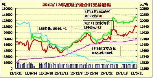 3月11日,商品棉交易各合同開盤互有漲跌,日內(nèi)窄幅震蕩,終盤均價續(xù)漲。其中MA1304合同漲幅57元/噸,為當(dāng)日漲幅最大合同;其他合同漲幅在5—56元/噸不等。交易成交10800噸,較上一交易日增加260噸。訂貨量較上一交易日增加300噸,累計訂貨16840噸。國內(nèi)棉花現(xiàn)貨價格繼續(xù)保持穩(wěn)定。當(dāng)前下游紡企生存環(huán)境雖較前期有所好轉(zhuǎn),但用工及原料成本的上升繼續(xù)對其有所牽制。美農(nóng)報告的利多氣氛已被提前消化,后期國內(nèi)棉價走勢仍將取決于新政策的引導(dǎo)。