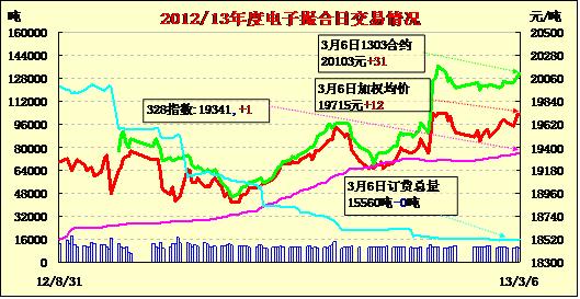 3月6日,商品棉交易各合同開盤高低不一,日內(nèi)震蕩上行,終盤收漲。MA1305合同漲幅59元/噸,為當(dāng)日漲幅最大合同;其他合同漲幅在21—57元/噸不等。交易成交10100噸,較上一交易日減少200噸。訂貨量無變化,累計訂貨15560噸。目前各地收購已基本結(jié)束,可供交易資源匱乏。據(jù)了解目前紡企開工率在80%左右,其更多的采購意向還是高等級棉。目前市場可供流通的高等級資源甚少是促進近幾日棉價走高的因素之一。
