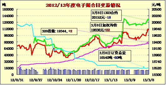 3月8日,商品棉交易各合同全線低開,日內(nèi)窄幅震蕩,終盤多數(shù)上漲。當日商品棉交易除MA1303合同均價小幅收跌外,其他合同均延續(xù)漲勢;其中MA1304合同漲幅37元/噸,為當日漲幅最大合同;其他合同漲幅在1—23元/噸不等。交易成交10540噸,較上一交易日減少180噸。訂貨量較上一交易日減60噸,累計訂貨16540噸。國內(nèi)現(xiàn)貨流通資源的不足,令下游需求更多的從儲備棉和進口棉中獲取,進口棉中國主港報價持續(xù)上漲;市場較為關(guān)注的新收拋儲政策或?qū)⒂趦蓵蟛艜雠_,所以短期市場棉價將更多的受到來自外圍市場趨勢的左右。