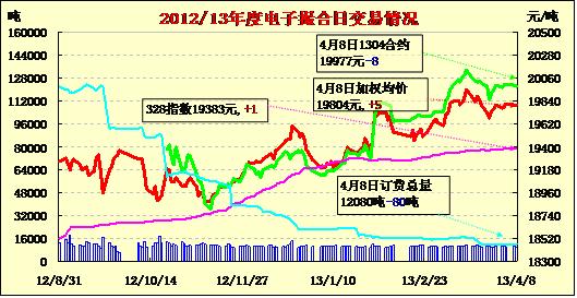 4月8日,商品棉交易各合同開盤高低不一,日內(nèi)窄幅整理,均價近跌遠漲。當日MA1304和MA1305分別小幅下跌8元/噸和1元/噸,其余合同漲20—26元/噸不等。交易成交10180噸,較上一交易日減少100噸。訂貨量減80噸,累計訂貨12080噸。在市場預(yù)期4月份或?qū)伋鲂禄ㄏ拢?a href='http://www.qdhqly.cn' title='錦橋紡織網(wǎng)' target='_blank'>紡織企業(yè)采購謹慎,現(xiàn)貨市場成交清淡,儲備競買熱情及成交比例也有下降。