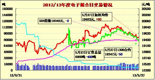 5月27日,商品棉交易多數(shù)合同高開(kāi),日內(nèi)震蕩幅度較大,均價(jià)近跌遠(yuǎn)跌。當(dāng)日MA1310和MA1311均價(jià)分別漲50元/噸和84元/噸,其余合同均價(jià)跌11-50元/噸。交易總成交16020噸,較上一交易日大幅增加500噸。MA1306成交640噸,成交回落。MA1309和MA1311合同成交量放大,分別成交4020噸和3660噸。其余合同成交變化不大,MA1307、MA1308和MA1310分別成交1860噸、330噸和2540噸??傆嗀浟繙p少400噸,累計(jì)訂貨6980噸。MA1307、MA1308和MA1310訂貨量分別減持220噸、100噸和100噸。MA1311訂貨量增持20噸。其余合同訂貨量不變。